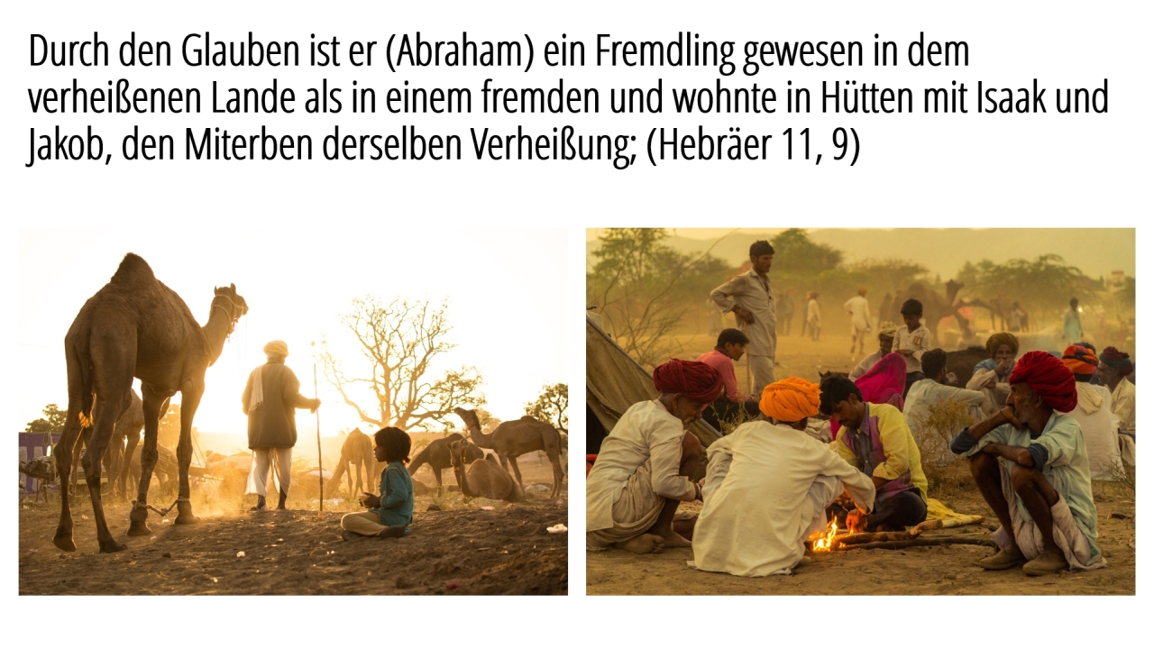 17 | Durch den Glauben ist er (Abraham) ein Fremdling gewesen in dem verheißenen Lande als in einem fremden und wohnte in Hütten mit Isaak und Jakob, den Miterben derselben Verheißung; (Hebräer 11, 9)