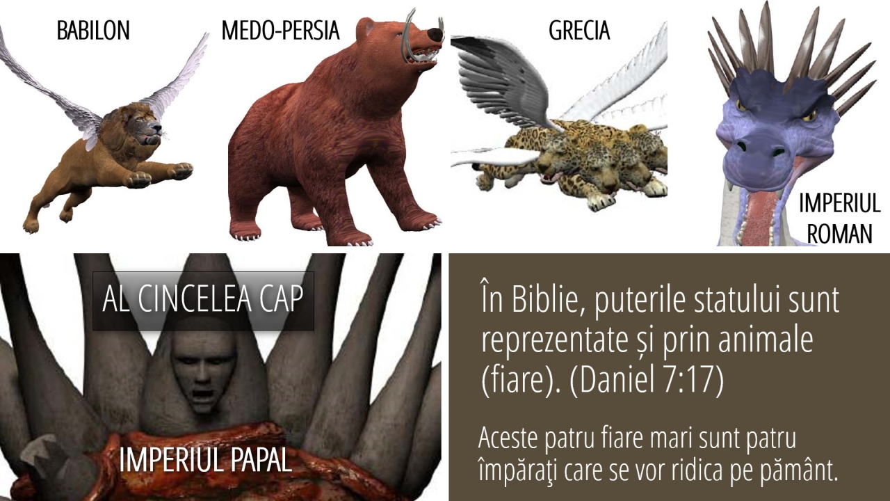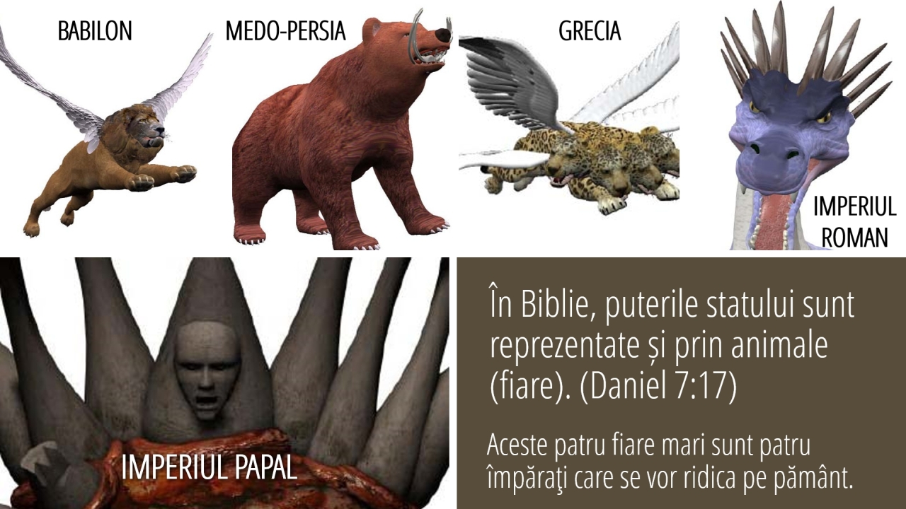 17 | În Biblie, puterile statului sunt reprezentate și prin animale (fiare). (Daniel 7:17)